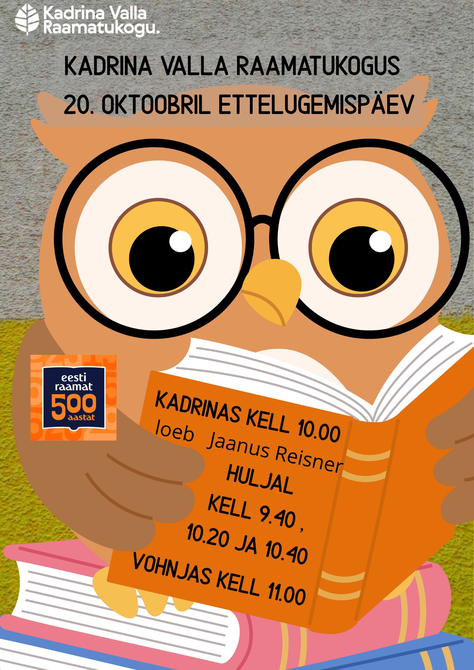 Iga aasta 20. oktoobril tähistatakse üle-eestilist ettelugemispäeva! Kadrina Valla Raamatukogus toimuvad ettelugemised lastele: Kadrinas kell 10.00, ette loeb Jaanus Reisner […]